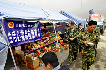 “三聯(lián)購(gòu)物”超市負(fù)責(zé)人楊波對(duì)記者說(shuō),他們這里的商品價(jià)格與震前沒(méi)有變化,電腦在震后就沒(méi)調(diào)整過(guò)價(jià)格。絕大部分商品都是庫(kù)存貨,有一些商品,如火腿腸、紅燒肉罐頭等出現(xiàn)斷貨。當(dāng)?shù)匾恍┨峁┥唐返膹S家在地震中毀損嚴(yán)重,要進(jìn)貨就得從成都進(jìn),但是有一些貨進(jìn)價(jià)漲了,如塑料制品,進(jìn)價(jià)漲了10%左右?蓙(lái)的顧客都是當(dāng)?shù)乩项櫩停蛲獾貋?lái)的志愿者、援建者,所以不能漲價(jià),不僅不能漲,還經(jīng)常贈(zèng)送一些東西給他們。 街頭一個(gè)經(jīng)營(yíng)小商品的婦女說(shuō):“我攤子的商品價(jià)格和地震前是一樣的,即使進(jìn)貨價(jià)漲一點(diǎn),我這里也不漲,大家都受災(zāi),將心比心。” 翔鳳橋社區(qū)受災(zāi)群眾安置點(diǎn)愛(ài)心超市工作人員介紹,這里的商品都是從成都市新都區(qū)桂湖摩爾超市配送過(guò)來(lái)的,所有商品都是特價(jià),基本上是該超市價(jià)格的90%,沒(méi)有利潤(rùn),如果算上運(yùn)輸費(fèi)用,是賠錢(qián)的,目的就是保證安置點(diǎn)里的受災(zāi)群眾能買(mǎi)得起。這里的生活日用品價(jià)格比外面都要便宜一些,如嬌子牌香煙一盒11.5元,外面要賣(mài)12元;可口可樂(lè)一聽(tīng)1.7元,外面賣(mài)2元;娃哈哈牌礦泉水一瓶1元,外面賣(mài)1.5元等。 每天到這個(gè)愛(ài)心超市購(gòu)物的受災(zāi)群眾有千人次左右,3名工作人員從早6時(shí)起忙到晚23時(shí),每天營(yíng)業(yè)額約有4000元左右!敖裉焱k,電腦無(wú)法操作,如果是過(guò)去就停業(yè)了,但現(xiàn)在依然營(yíng)業(yè),記不住的商品價(jià)格,就跟大家商量著來(lái),總之不能讓受災(zāi)群眾感到不方便!币幻ぷ魅藛T說(shuō)。