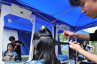 6月8日,一名理發(fā)師在為受災(zāi)群眾修剪頭發(fā)。新華社記者 楊俊江