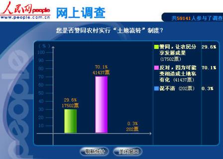 30年改革開放帶來農(nóng)村巨變。十七屆三中全會召開,審議通過了《中共中央關于推進農(nóng)村改革發(fā)展若干重大問題的決定》,標志著我國農(nóng)村改革站在一個新的歷史起點上。其中“土地流轉(zhuǎn)”因為被廣泛關注和熱議,已經(jīng)成為包括網(wǎng)絡在內(nèi)的各種媒體的流行詞。中國共產(chǎn)黨新聞網(wǎng)針對“土地流轉(zhuǎn)”推出網(wǎng)上調(diào)查《您是否贊同在我國農(nóng)村實行“土地流轉(zhuǎn)”制度?》,截止到10月20日9:00,共有59141人參與調(diào)查,網(wǎng)友留言278條。