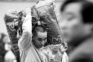 | 11月23日,一名返鄉(xiāng)的農(nóng)民工肩扛行李走出安徽阜陽火車站。安徽省要求各地建立農(nóng)民工返鄉(xiāng)旬報制度。新華社發(fā) |