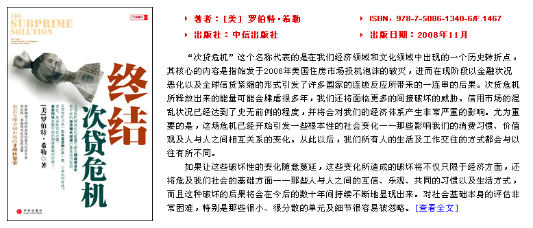 | 希勒的新書對這次次貸危機(jī)進(jìn)行了深入的分析,為政策制定者、華爾街和全球投資者提供了深入而細(xì)致的參考。 |